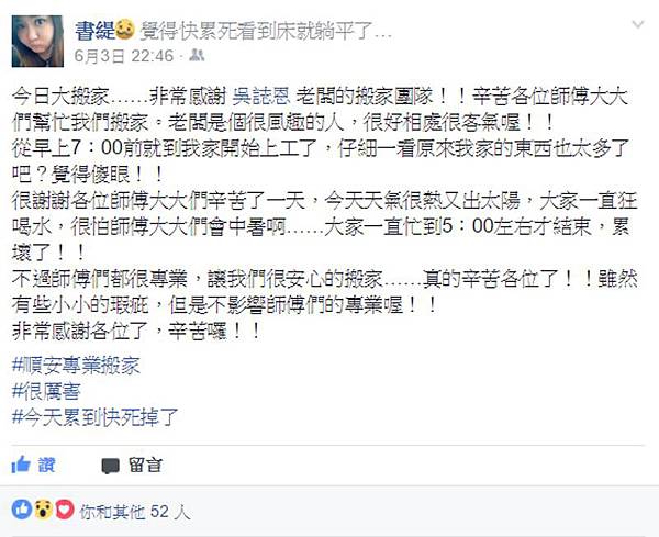 順安專業搬家 以人工吊掛進行,注重客戶的家具安全搬移,在包裝及運送過程。感恩@書緹小姐的鼓勵。順安專業搬家會更努力的。
